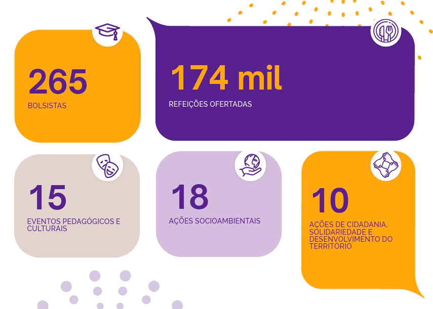 Atuamos na educação formal das crianças de 4 a 11 anos de idade contemplando desde a Educação Infantil até o 5º Ano do Ensino Fundamental. Atendemos por volta de 280 alunos por ano, sendo 179 em período integral e 101 em meio período. Além da bolsa de estudos integral, os alunos recebem material didático, uniforme e alimentação gratuitos.